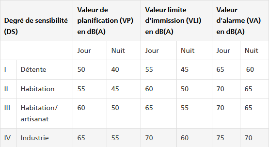 Selon les directives de l’Office fédéral de l’environnement (OFEV), les valeurs limites de bruit pour les zones résidentielles sont strictement encadrées. Voici quelques repères :